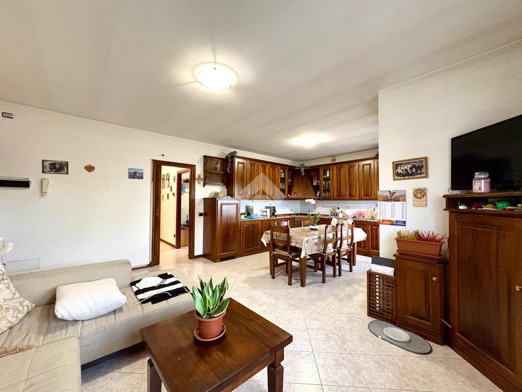 All'interno, una luminosa sala con angolo cottura offre uno spazio accogliente per la vita quotidiana.